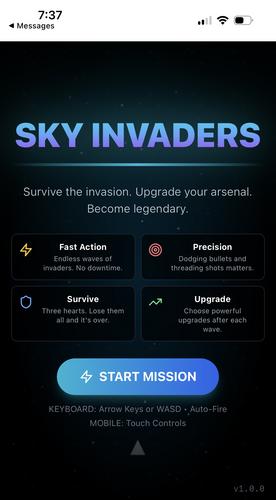 Sky Invaders is a quick, arcade-style shooter where you dodge fire, blast enemy ships, and survive as long as possible. Waves get faster, patterns get tighter, and every mistake feels expensive. It is built to be simple on the surface and just chaotic enough to stay interesting.
